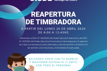Reapertura de timbradoraA partir del Lunes 20 de Abril 2020 de 8:00 a 12:45hs