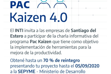 PAC Kaizen 4.0El INTI invita a las empresas de Santiago del Estero a participar de la charla informativa del programa Pac Kaizen que tiene como objetivo la implementación de herramientas para la mejora de la productividad.
