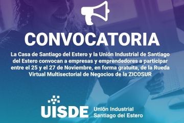 NOTA DE CONVOCATORIAde la Casa de Santiago del Estero y la Unión Industrial de Santiago del Estero convocando a empresas y emprendedores a participar entre el 25 y el 27 de Noviembre , en forma gratuita, de la Rueda Virtual Multisectorial de Negocios de la ZICOSUR