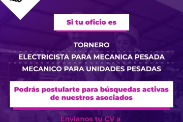 Búsquedas activas de nuestros asociadosSi tu oficio es Tornero, Electricista para Mecánica Pesada, Mecanico para Unidades Pesadas podrás postularte.